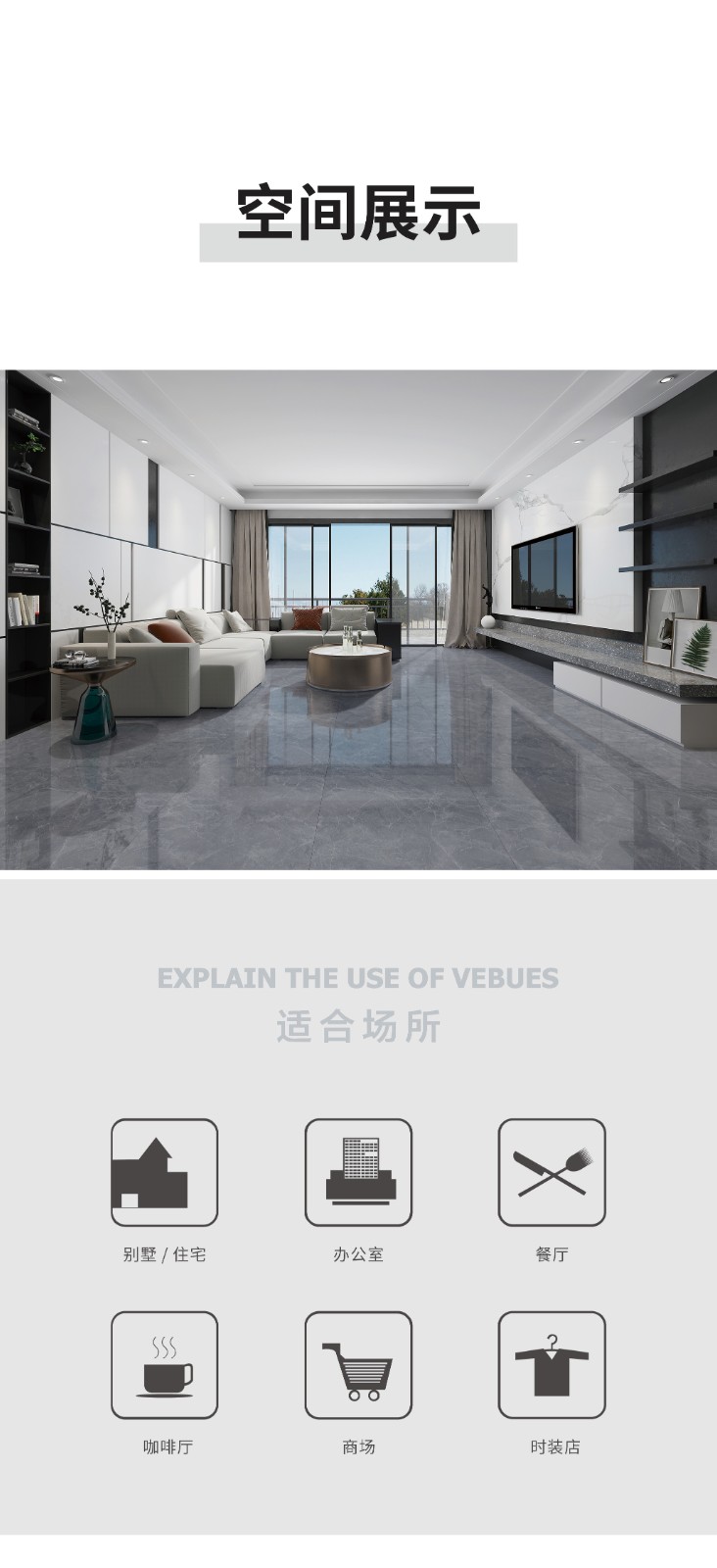 恒福瓷砖产品品类涵盖岩板、世纪大板、大理石瓷砖、全抛釉、玻化砖、釉面砖等配套设施,一站式满足消费者个性消费需求。