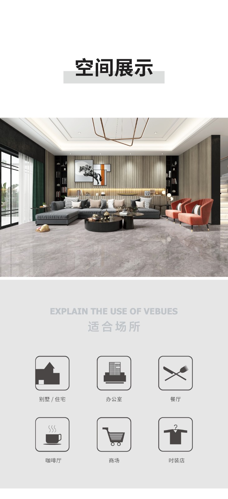 恒福瓷砖产品品类涵盖岩板、世纪大板、大理石瓷砖、全抛釉、玻化砖、釉面砖等配套设施,一站式满足消费者个性消费需求。