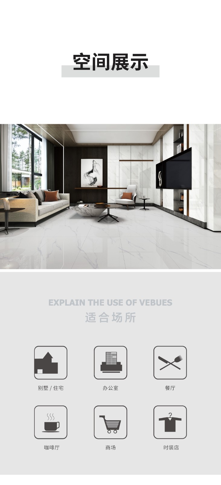 恒福瓷砖产品品类涵盖岩板、世纪大板、大理石瓷砖、全抛釉、玻化砖、釉面砖等配套设施,一站式满足消费者个性消费需求。