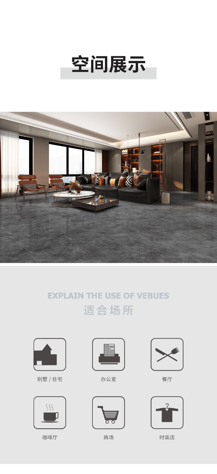 恒福瓷砖产品品类涵盖岩板、世纪大板、大理石瓷砖、全抛釉、玻化砖、釉面砖等配套设施,一站式满足消费者个性消费需求。