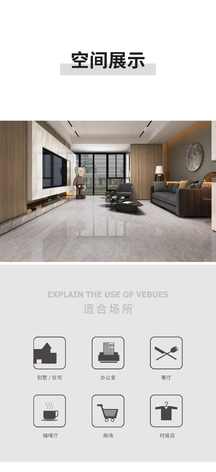 恒福瓷砖产品品类涵盖岩板、世纪大板、大理石瓷砖、全抛釉、玻化砖、釉面砖等配套设施,一站式满足消费者个性消费需求。