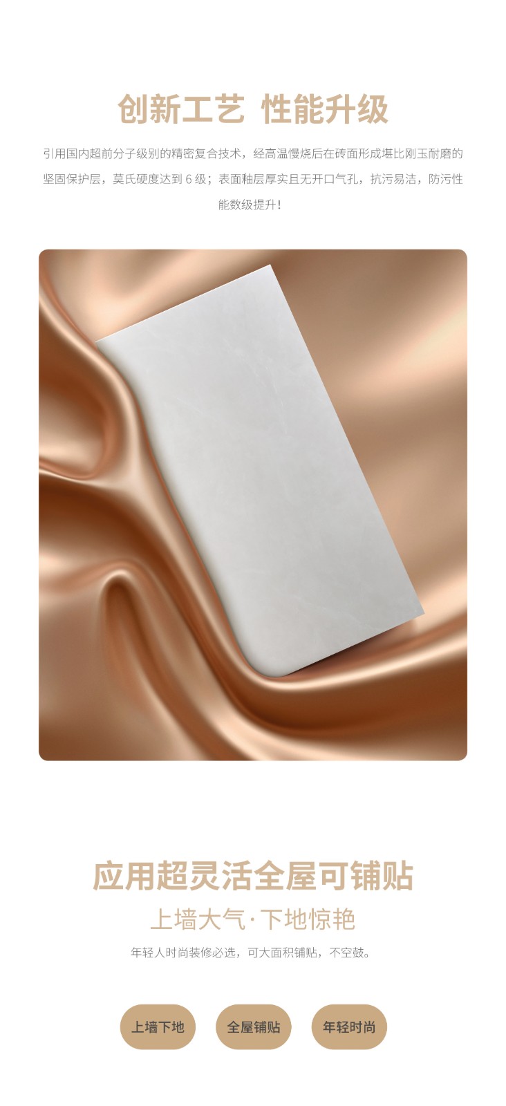 恒福瓷砖产品品类涵盖岩板、世纪大板、大理石瓷砖、全抛釉、玻化砖、釉面砖等配套设施,一站式满足消费者个性消费需求。