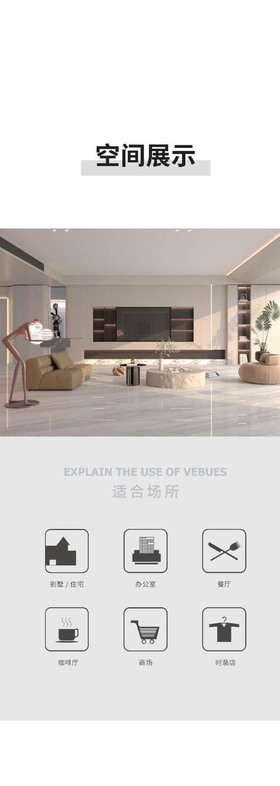 恒福瓷砖产品品类涵盖岩板、世纪大板、大理石瓷砖、全抛釉、玻化砖、釉面砖等配套设施,一站式满足消费者个性消费需求。